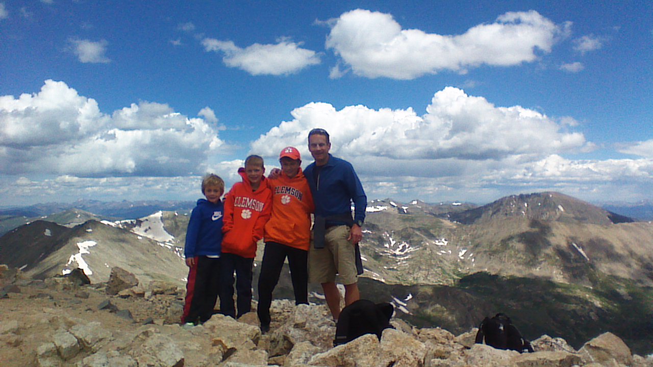 This time, they made the peak at around 11:00 AM, and just before bad weather set in.  Elizabeth was an incredible trooper, as altitude sickness really hit her hard at around 13,500 feet. With 2 false summits, it was all she could do to stay on her feet.  You can also see that we brought along a visitor for this ascent.  Benjamin and Jonathan were trying to win a picture contest hosted by their orthodontist’s office.  Though they didn’t win, I would be surprised if anyone else tried any harder than they did.